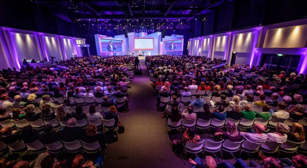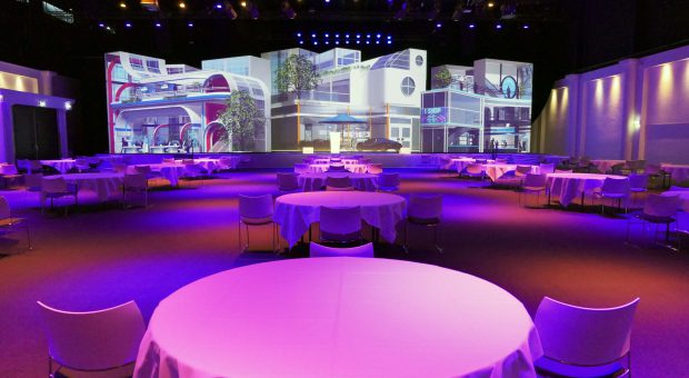 Onze Event Hall is uitgerust met een indrukwekkend 45 meter breed 3D-projectiedecor. We projecteren in deze evenementenhal in de breedte van de ruimte waardoor de spreker dichtbij het publiek staat. Dus ondanks het grote decor, is er een intieme sfeer tijdens een key-note.